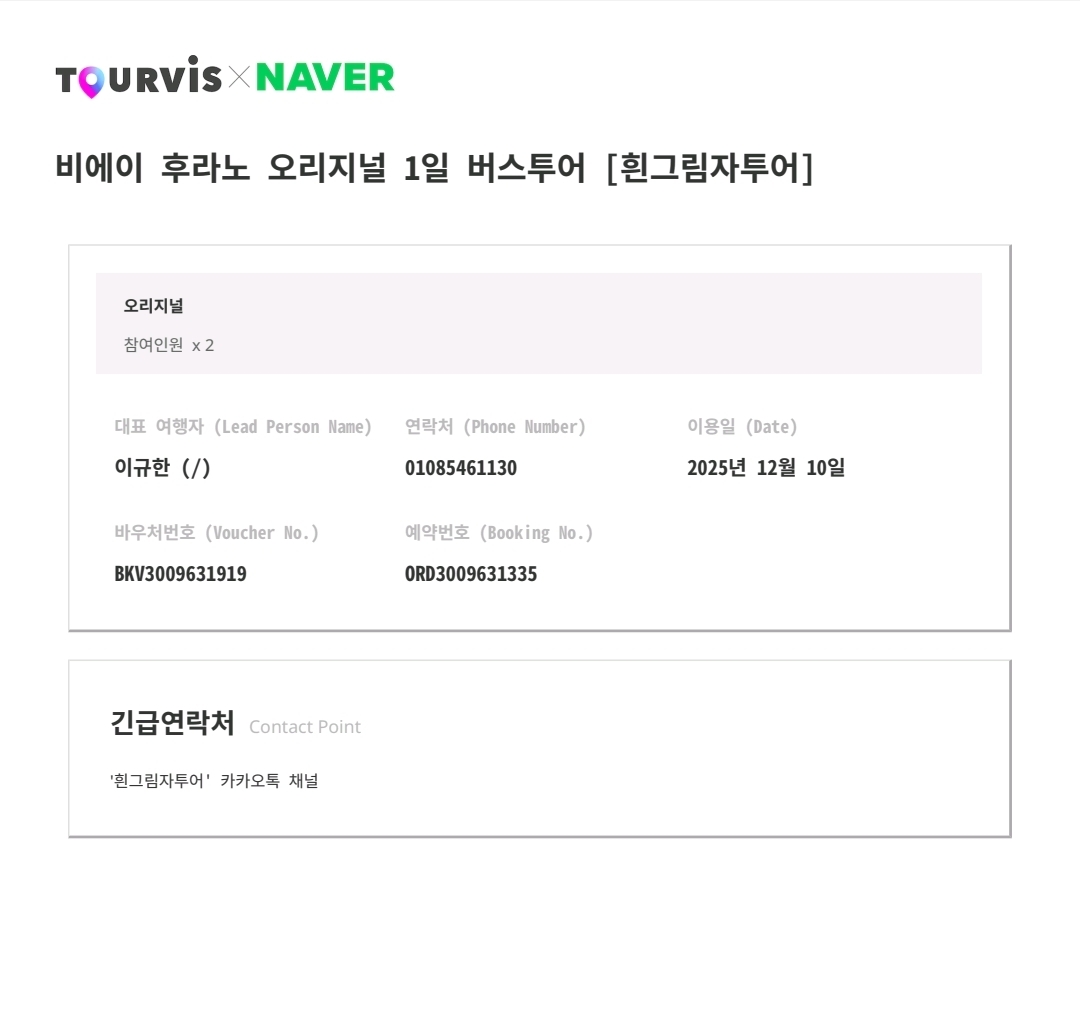 예약하신 투어명, 참여일자, 구매자분의 성함과 증빙 서류를 같이 제출 부탁드립니다.